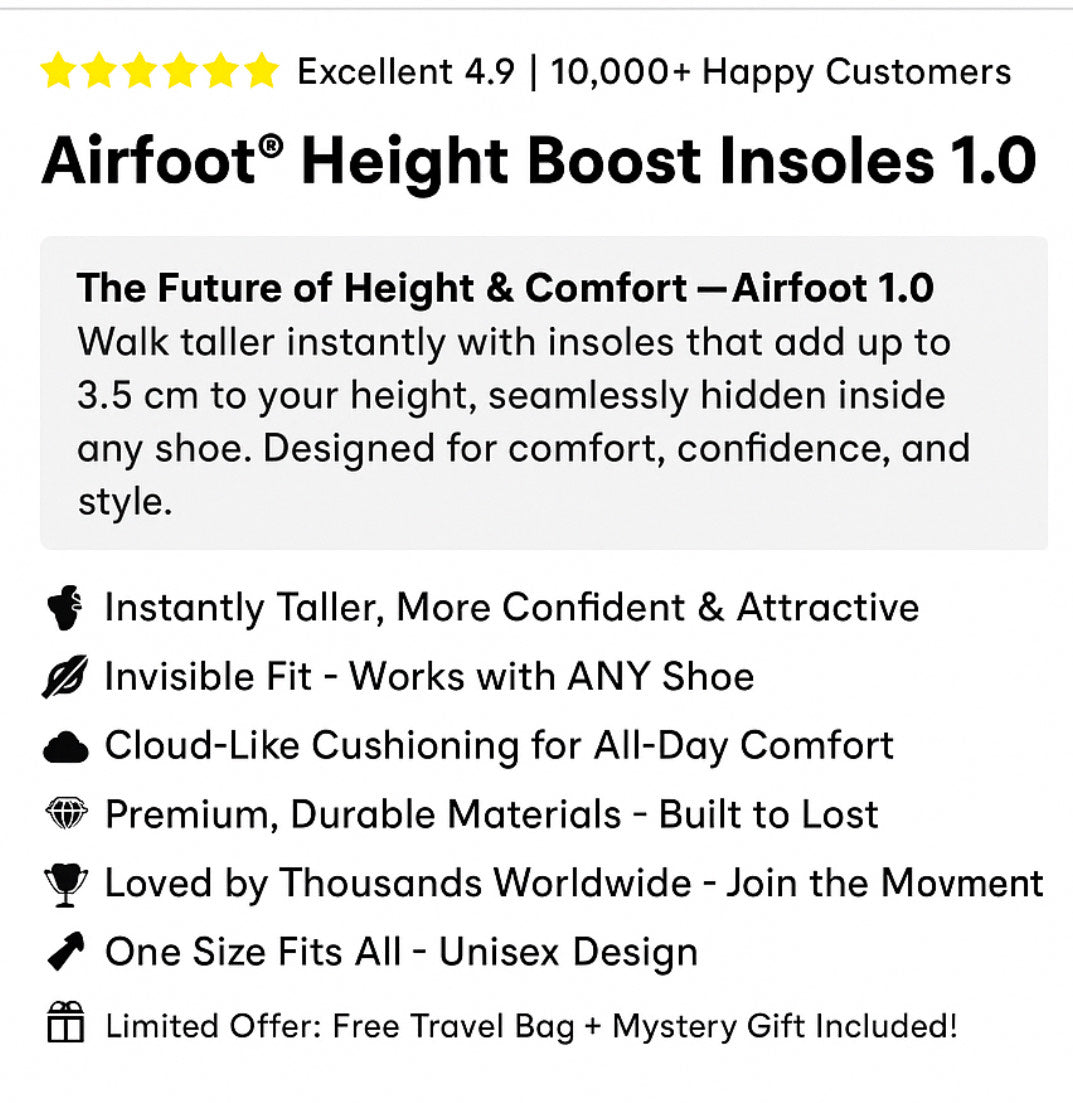 Engineered with soft, breathable silicone, AirFoot raisers mold naturally to your heel for all-day support. No slipping, no pressure points — just a seamless lift that feels as natural as walking on air.